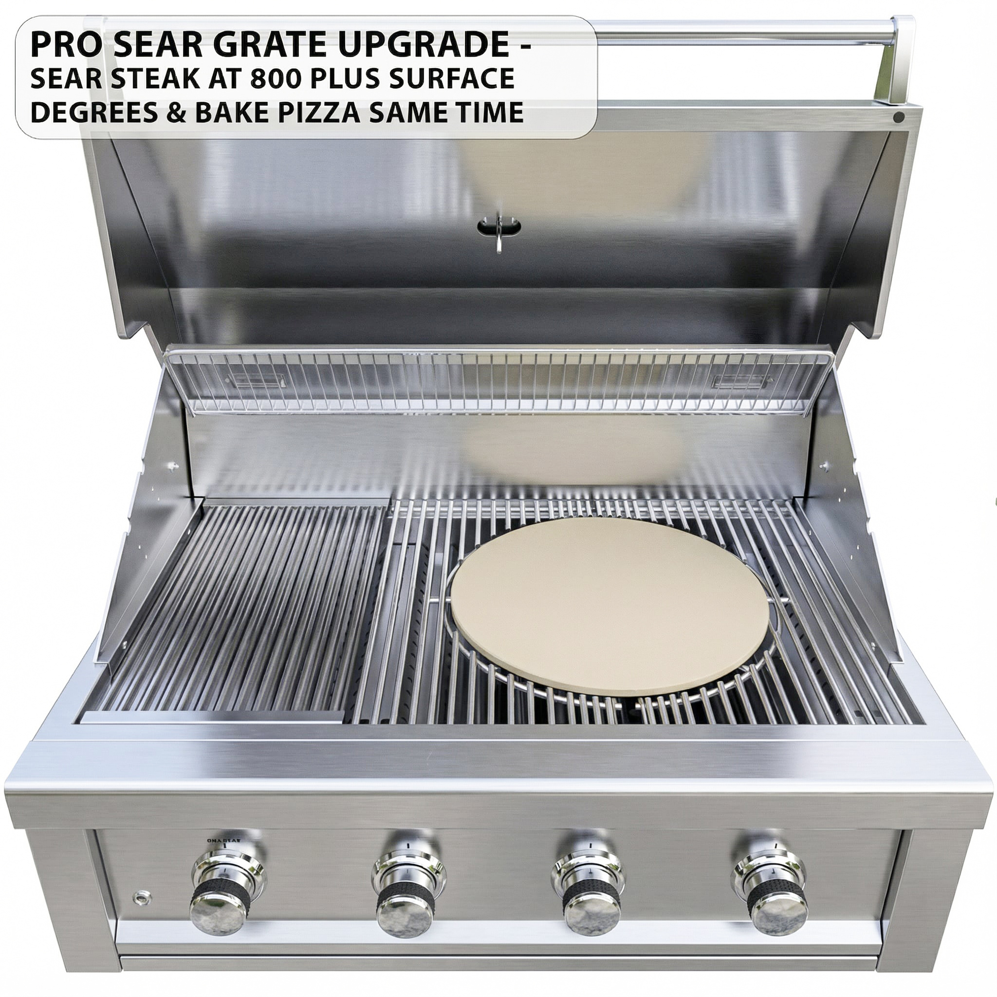 The Ruby 4 Burner Pro-Sear 36″ – RUBY4B is crafted for serious outdoor cooking with a refined footprint. Every element is built from 304‑grade stainless steel to deliver durability, performance, and premium styling. The exclusive 11‑gauge fabricated I‑burners generate up to 80,000 BTUs of grilling power. Flame‑thrower ignition on each burner delivers reliable starts every time. Solid 304 stainless steel cooking grids include variable rod spacing to accommodate large cuts or smaller items with ease. Interior halogen lights and LED color‑changing control panel lights enhance your nighttime cooking experience. Upgrade paths include accessories such as a pizza stone, griddle, charcoal tray, deep fryer, sear grate, warming rack, and dual rotisserie rods. Designed and engineered in the USA, this grill is built to last and impress.