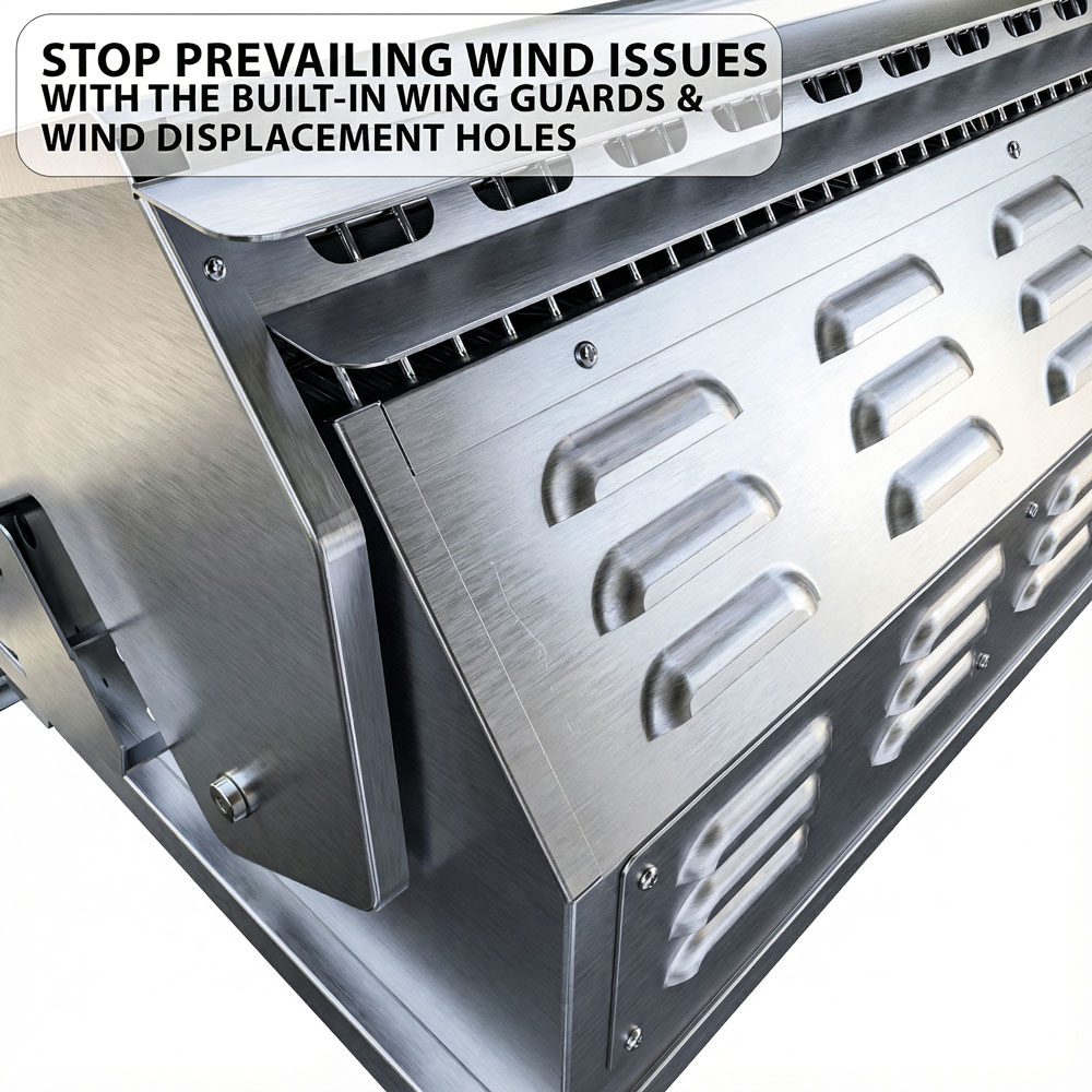 - Easy‑service design with drop‑open panel and back hood wind guards for convenient access